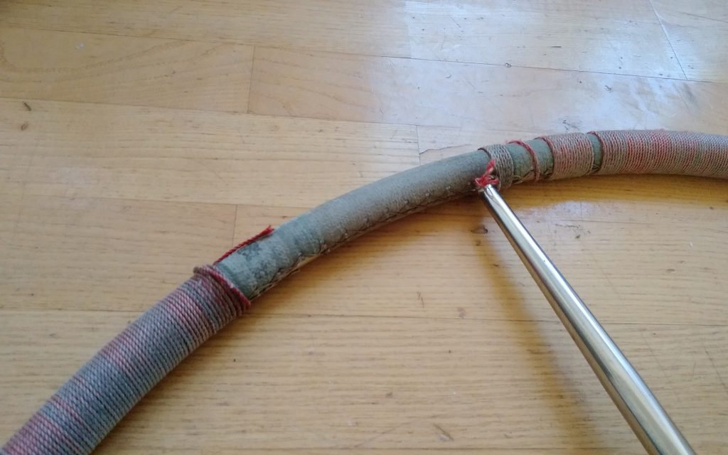 Ein mittlerweile ziemlich schäbig aussehendes Steuerrad. Zu sehen ist eine alte Umwicklung und ein noch älterer Lederbezug.